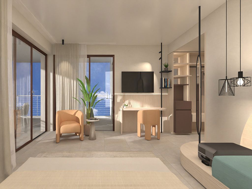 Das Zimmer mit seinen großen Fenstern, mit seinen raffinierten „Made in Italy“ Möbeln und den zarten Farben verfügt über ein Queen-Size-Doppelbett mit orthopädischer und antiallergischer Matratze und Kissen, ein Schlafsofa, ein 50" Smart-TV, ein elegantes Bad mit begehbarer Dusche, Doppelwaschbecken, einer edlen Pflegeserie und flauschige Bademäntel. Der helle Wohnbereich mit Wasserkocher, Teeset und Kaffeemaschine bietet eine perfekte Entspannungsecke mit einzigartigem Blick auf das weite Meer.