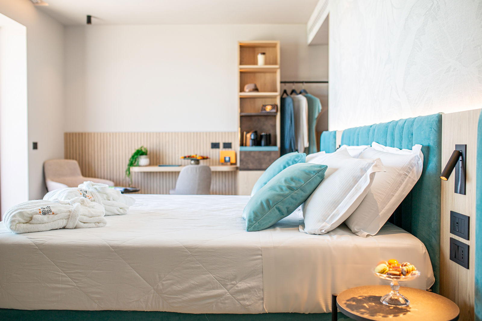 Dagli arredi contemporanei Made in Italy e dalle tinte delicate, la camera ospita un letto matrimoniale queen size con materasso e cuscini ortopedici e antiallergici per sogni rigeneranti, alcune camere con divano letto estraibile, una zona living dove prendersi un caffè ammirando l’azzurro del mare e un bagno con doccia walk in, doppio lavabo.