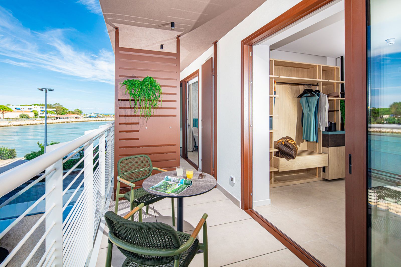 Dalle grandi vetrate, con arredi Made in Italy contemporanei e dalle tinte delicate, la camera presenta un letto matrimoniale queen size, dotato di materasso e cuscini ortopedici e antiallergici, un divano letto, bagno con doccia walk in, doppio lavabo, ricercati prodotti per il set di cortesia per rituali di benessere e morbidi accappatoi.